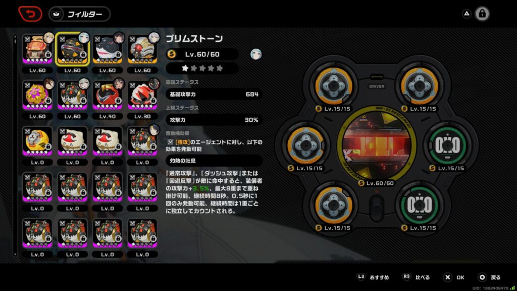 上級ステータスで攻撃力30% 音動機効果で《通常攻撃、ダッシュ攻撃、回避反撃》命中で攻撃力3.5% 最大8重まで重ね掛け可能な攻撃力特化の汎用音動機です。